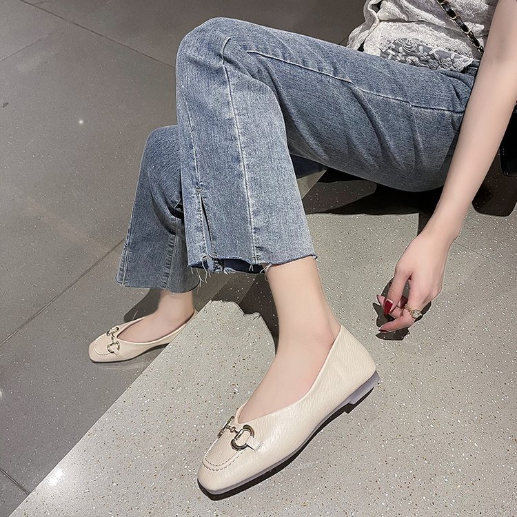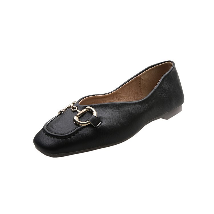 2021 Autumn New Retro flat sole single shoes metal buckle square head shallow mouth soft bottom pea shoes fashion leather women's shoes