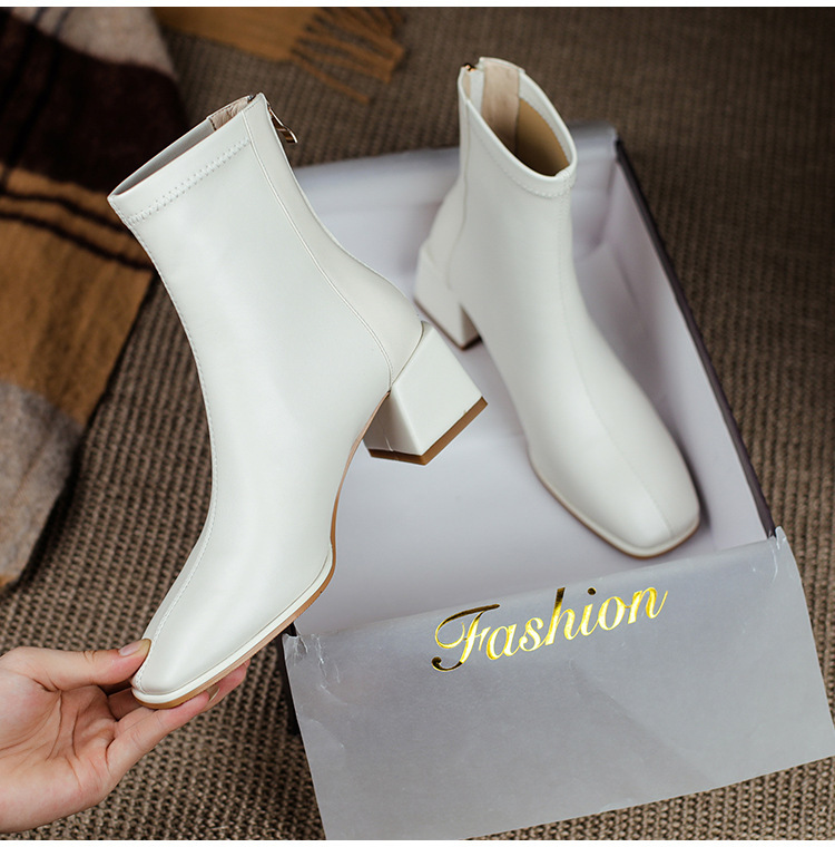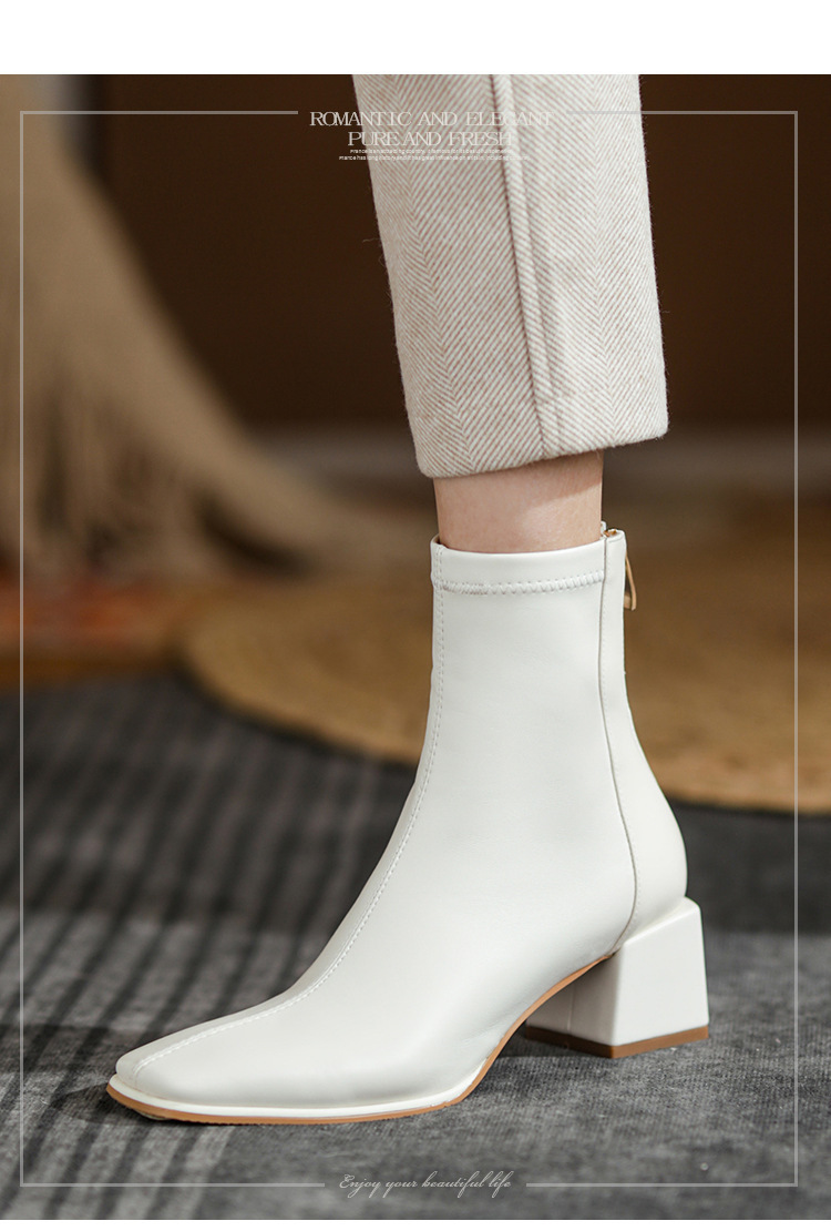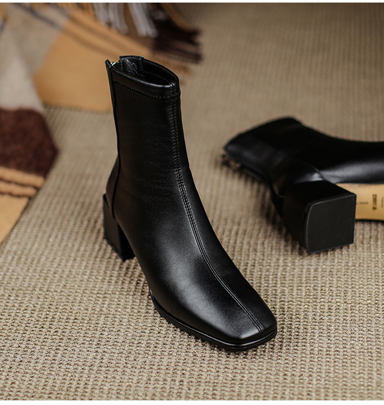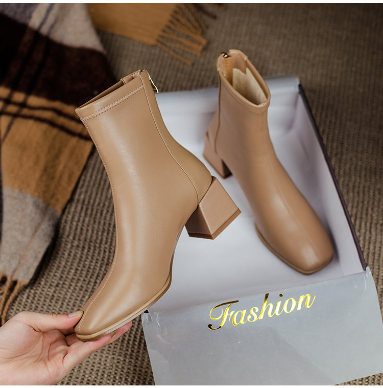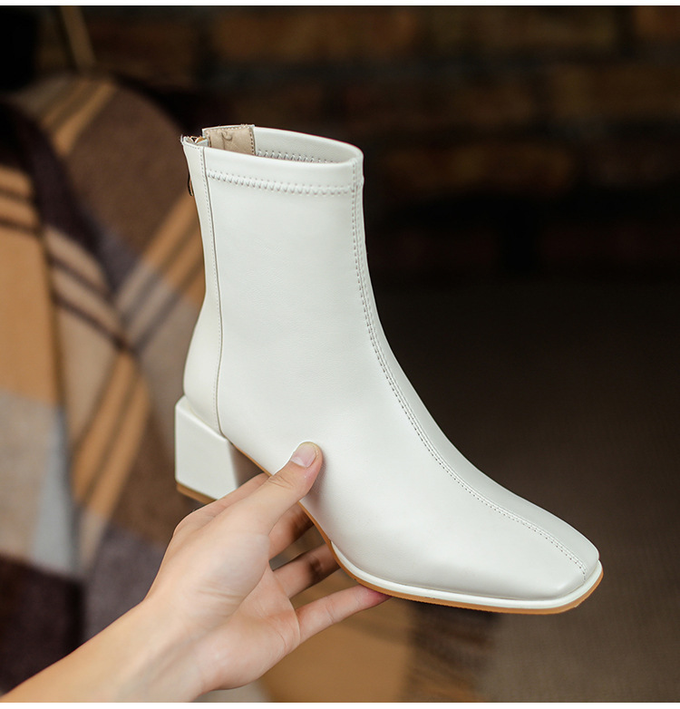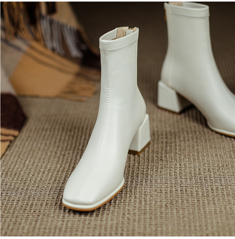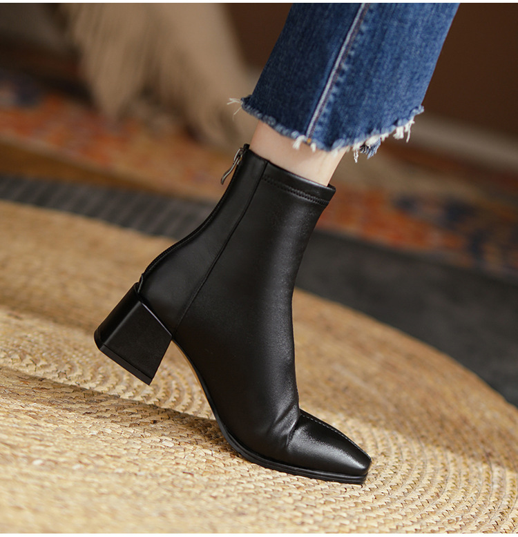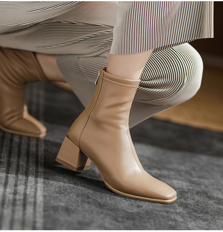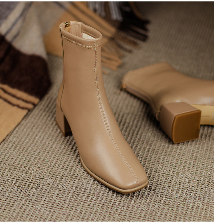 Slim elastic thin boots women's short boots 2021 summer new square head retro versatile bare boots middle heel spring and autumn single boots